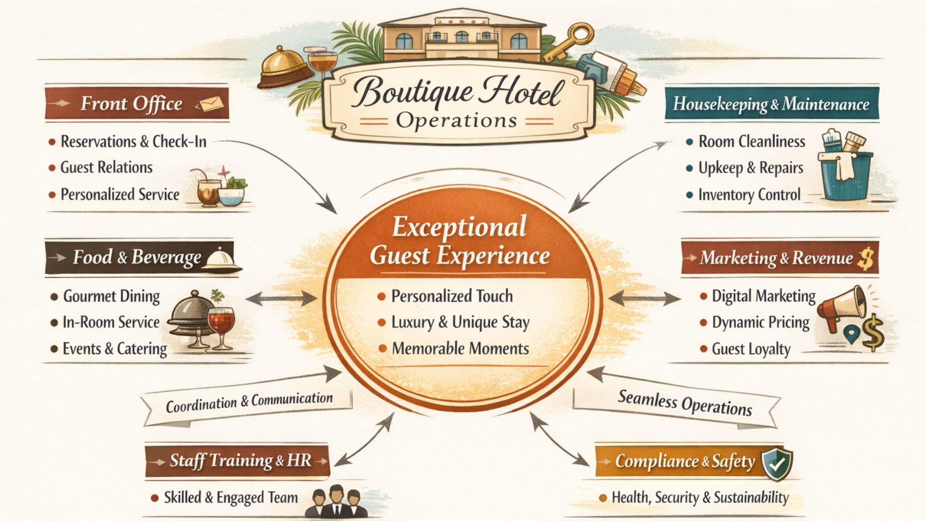 While these pillars exist in all hotels, boutique hotels implement them with smaller, cross-trained teams and a focus on personalization over scale.